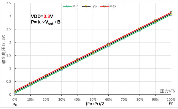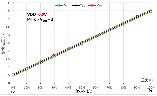 Megjegyzés: A Vout az analóg kimeneti feszültség (egysége: V); P a nyomásérték (kPa-ban); k. A B a lineáris együtthatót és az eltolást jelenti, amint az az alábbi táblázatban látható.
